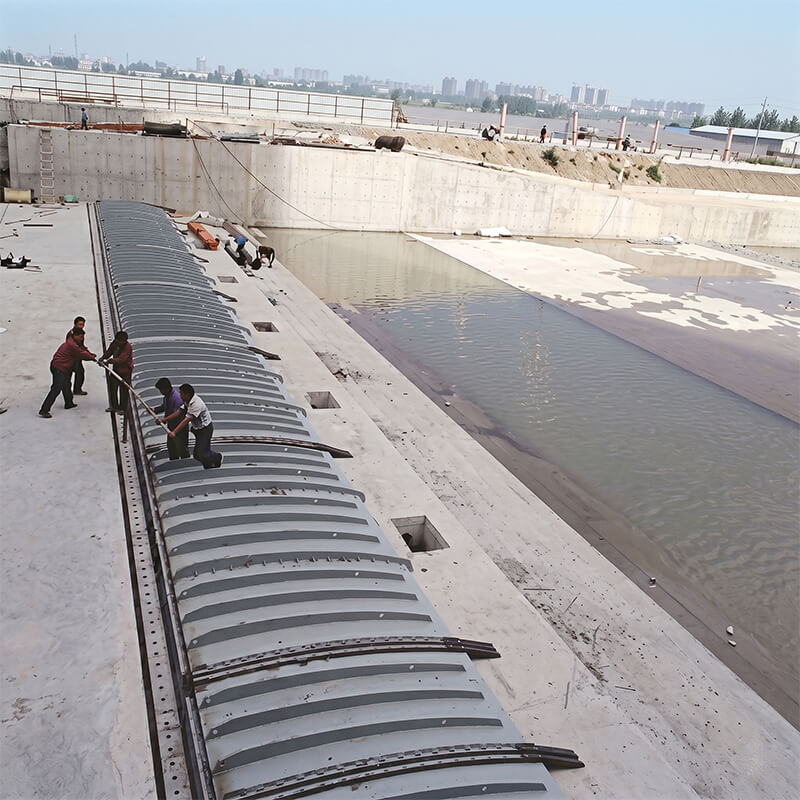 The structural composition consists of a faceplate, reinforcing ribs, and restraint belts. The faceplate is fabricated from high-strength structural steel with a minimum thickness of 12 mm and features reinforcing ribs welded to the upstream face. Each unit measures 5 meters in length, and adjacent units are interconnected via flexible joints using high-strength rubber-composite belts. When fully raised, the gate maintains a specific angle relative to the horizontal plane, thereby ensuring that the gate structure is capable of collapsing (folding down) under its own weight. To enhance protection of the air bladder during collapse, the gate plate is designed with a specific curvature. Under normal operating conditions, the pneumatic shield-type rubber dam permits overflow across its crest, creating an aesthetic water landscape. To prevent the gate body from tipping upstream—particularly when downstream water levels are high or under the influence of wind forces—foldable safety restraint belts are installed on the downstream side of the gate; these restraint belts are fabricated from high-strength synthetic rubber.